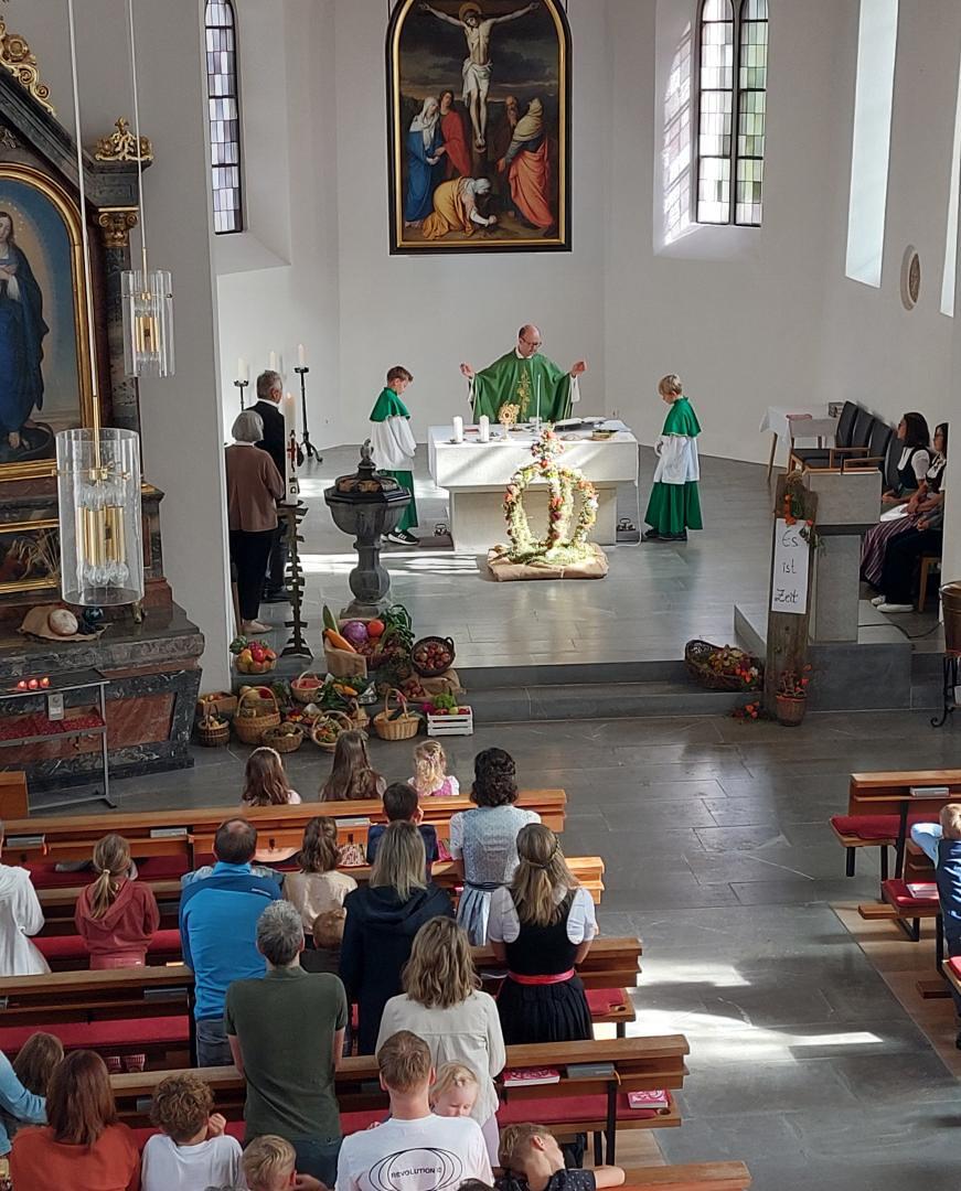 Am Sonntag, 24.09.2023, feierte unsere Pfarrgemeinde in einer von den Bäuerinnen prachtvoll geschmückten Kirche Erntedank.